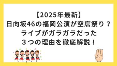 「日向坂46の福岡公演の空席が目立った理由を知りたい!」「内容は良いのに、日向坂46のライブがガラガラなのは何故?」「日向坂46はもう人気ない?」上記のように日向坂46について気になっている方は少なくないかもしれません。結論、2025年の日...