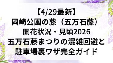 春の花ガイド 【4/29最新】岡崎公園の藤(五万石藤)開花状況・見頃2026|五万石藤まつりの混雑回避と駐車場裏ワザ完全ガイド 「2026年の岡崎公園の藤(五万石藤)の開花状況や見頃について知りたい!」「今年の五万石藤まつりの混雑回避を知りたい!」「岡崎公園の藤(五万石藤)を見に車で行くので、駐車場情報を知りたい!」このように、2026年の岡崎公園の藤(五万石藤)な... 2026.05.01 春の花ガイド藤