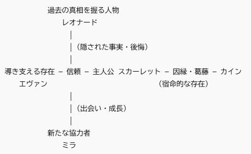 関係図で見ると、スカーレットを中心に信頼と疑念が交錯し、誰の言葉を信じるべきか分からない緊張感が物語を支えています。